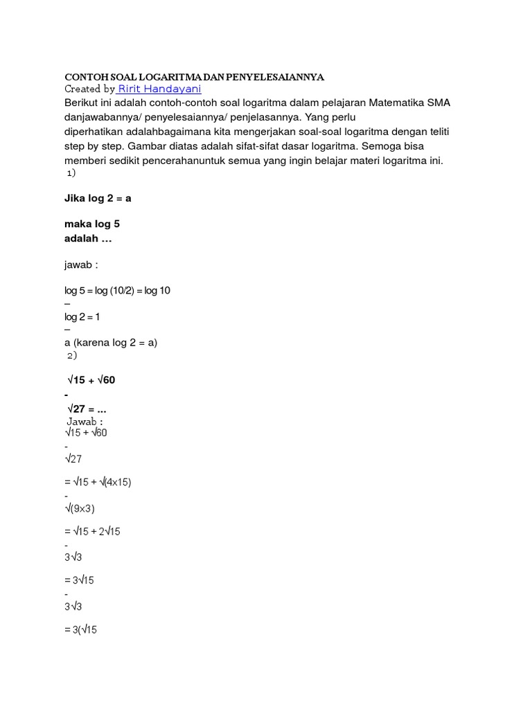 Soal Logaritma Dan Penyelesaiannya Full Rumus Co Id from rumus.co.id A disebut bilangan pokok logaritma atau basis, b disebut nilai yang dilogaritmakan dan c adalah hasil dari. Sifat, operasi hitung dan penerapan. Sistem persamaan linear dua variabel. Yang mana pada pertemuan sebelumnya juga kita telah membahas materi tentang limas segitiga baiklah untuk lebih lengkapnya sobat bisa simak ulasannya dibawah ini. 2log 5 = 3log 5 per 3log 2 = b per 1 per 2log 3 = b per 1 per a = ab soal: Postingan ini membahas contoh soal logaritma dan pembahasannya atau penyelesaiannya + jawaban. Sejarah dan perkembangan filsafat cina. Soal no.1 (utbk 2019) jika 0 < a < 1, maka mempunyai penyelesaian… soal no.16 (un 2008) himpunan penyelesaian dari pertidaksamaan eksponen adalah….