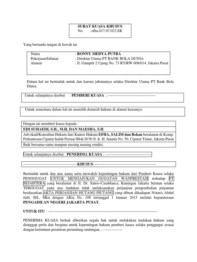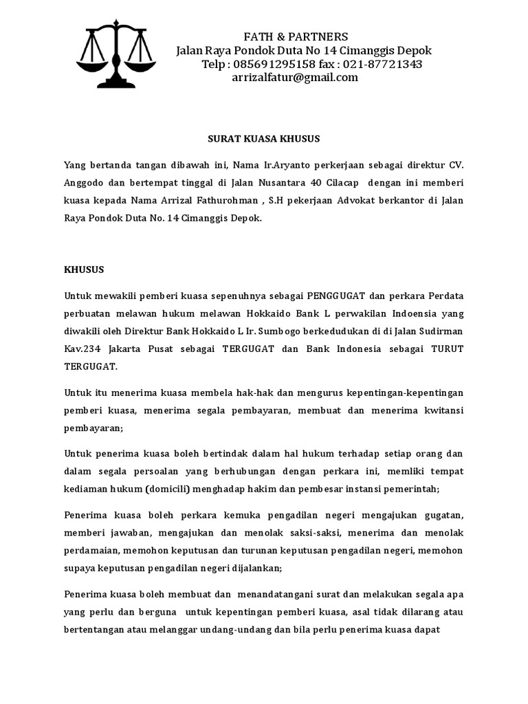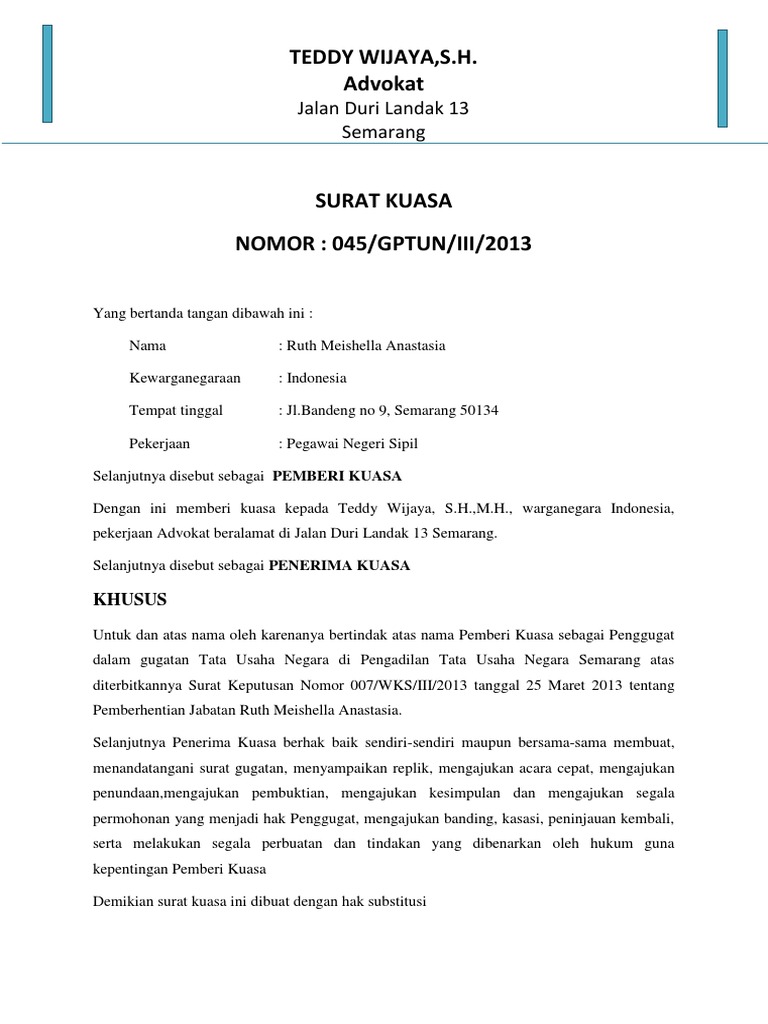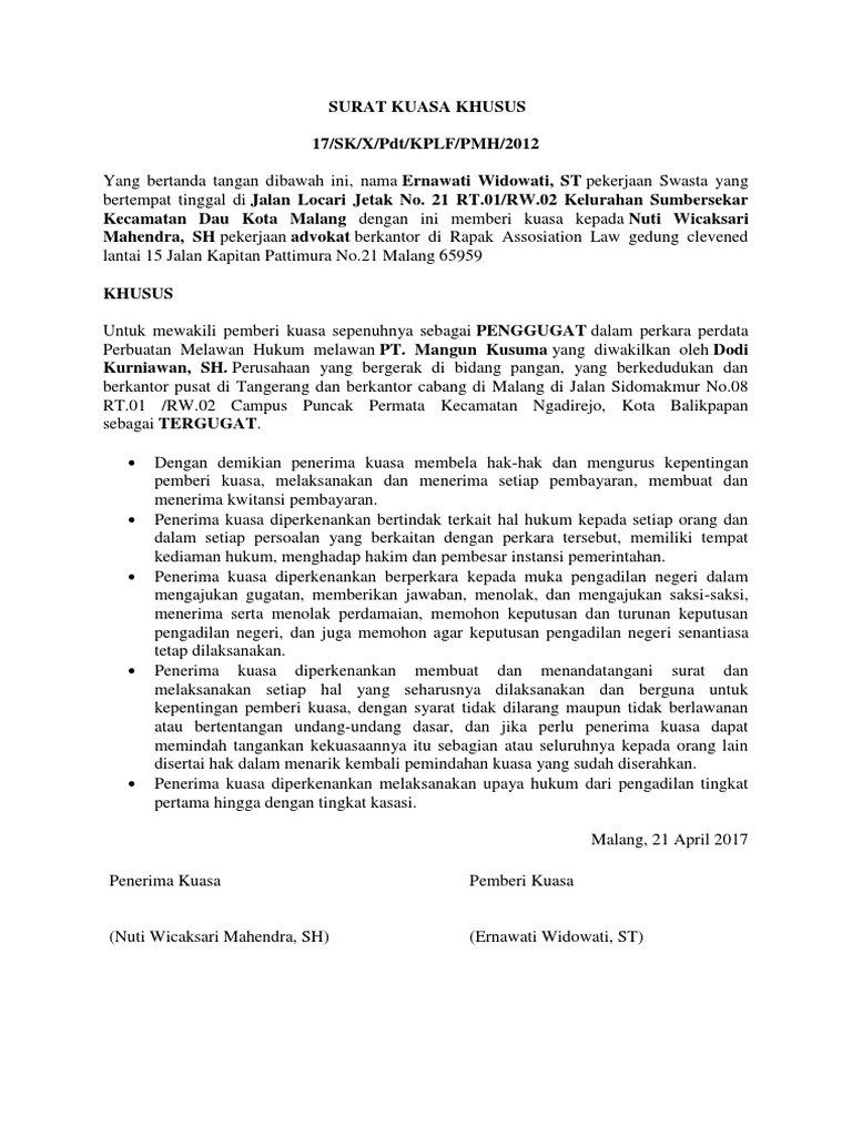 Blogerisman, 26 tahun, pekerjaan penulis berdomisili di jalan raya cipayung no 27 depok, provinsi jawa barat. Surat kuasa khusus meliputi kegiatan tertentu yang dialihkan ke penerima kuasa. Materai sebagai simbol kekuatan hukum. Surat kuasa khusus merupakan surat kuasa yang dibuat oleh seseorang atau perusahaan kepada pihak advokat (pengacara) guna menyelesaikan untuk serta atas nama pemberi kuasa telah mengajukan dan juga menangani gugatan perdata mengenai perbuatan melawan hukum selaku. Untuk mewakili pemberi kuasa sepenuhnya sebagai penggugat dalam perkara perdata perbuatan melawan hukum melawan pt.