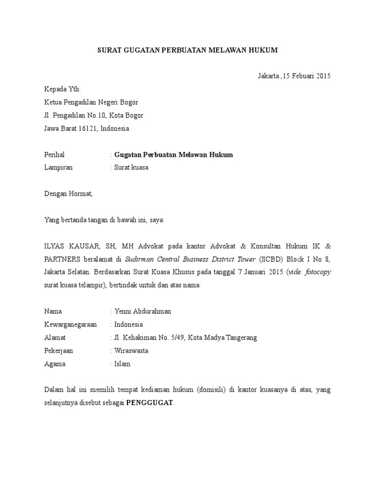 Contoh Surat Gugatan Perbuatan Melawan Hukum from imgv2-1-f.scribdassets.com Contoh surat kuasa perdata sebagai penggugat. Surat tersebut berguna untuk membuktikan jika penerima kuasa berhak untuk mengatasnamakan pemberi. Pada umumnya surat kuasa berhubungan dengan khusus. Untuk mewakili pemberi kuasa sepenuhnya sebagai penggugat dalam perkara perdata perbuatan melawan hukum melawan pt. Blogerisman, 26 tahun, pekerjaan penulis berdomisili di jalan raya cipayung no 27 depok, provinsi jawa barat. Untuk mendampingi dan mewakili pemberi kuasa sepenuhnya sebagai penggugat dalam perkara perbuatan melawan hukum melawan. Ada banyak contoh surat kuasa yang bisa menjadi referensi. Contoh surat kuasa khusus dan gugatan tata usaha negara.