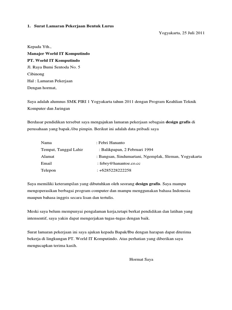 Namun kita tentu sudah tahu kalau mencari pekerjaan saat ini bukanlah perkara yang mudah. Tempat dan tanggal pembuatan surat, nomor surat, lampiran, hal, dan banyak lagi lainnya yang dibahas di artikel ini. Surat lamaran kerja merupakan sebuah dokumen yang dikirim oleh seorang pencari kerja untuk melamar pekerjaan di sebuah perusahaan. Atas perhatian dan kesempatan yang diberikan, saya ucapkan terima kasih. Surat ini dibutuhkan guna melamar pekerjaan baru untuk kamu yang lulus kuliah, pindah kerja, cari suasana baru maupun fresh graduate. Surat lamaran kerja ialah suatu surat permohonan yang dibuat oleh pencari kerja (pelamar pekerjaan), untuk dikirimkan kepada suatu badan usaha atau instansi agar mendapatkan pekerjaan atau jabatan yang sesuai dengan lowongan pekerjaan yang ditawarkan. Bentuk surat lamaran kerja yang ketiga adalah semi block style atau setengah lurus. Surat lamaran kerja umum biasanya digunakan untuk melamar sebuah pekerjaan pada sekolah, perusahaan ( pt ), bimbingan belajar dan lainnya tanpa ada informasi lowongan kerja. Untuk bentuk surat yang satu ini lebih sering digunakan baik oleh pelamar dan juga perusahaan untuk surat menyurat. Menulis surat lamaran pekerjaan bahasa inggris mungkin bukan hal yang mudah bagi sebagian orang. Berikut contoh surat lamaran pekerjaan yang bisa kamu download file dokumennya juga, link di bagian akhir artikel. Membuat surat lamaran yang bsia menarik perhatian bos perusahaan pasti bsia memperbesar peluangmu untuk dipanggil walaupun bisa dikatan nah, sekarang saya akan beri beberapa contoh surat lamaran pekerjaan (resume) yang bisa menjadi panduan anda untuk melamar pekerjaanm. Sistematika surat lamaran pekerjaan meliputi: