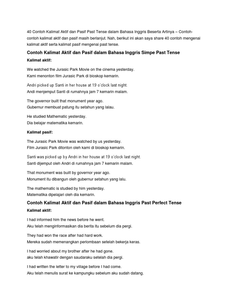 Anda bisa menggunakan contoh kalimat diatas sebagai sarana untuk belajar bahasa inggris dengan mudah atau sarana berlatih agar dapat menggunakan past tense dengan baik sesuai dengan tipenya. Selepas itu semua, tentu umumnya liburan tidak hanya bersantai saja, kamu pasti mendapatkan tugas tertentu contohnya materi bahasa inggris. Rumus simple past tense affirmative: Simple past tense digunakan untuk membicarakan kejadian atau aksi yang telah selesai dan terjadi di masa lampau. Salah satu bentuk tenses yang digunakan untuk menjelaskan peristiwa yang lampau atau sudah terjadi. Penulisan experience menggunakan genre narrative text. S + v2 + o (subject + verb2 + objek) atau. Contoh kalimat passive voice dalam 16 tenses bahasa inggris. 50 kalimat bahasa inggris dengan menggunakan antonym (aku ada di sana saat kamu meneleponnya.) Yuk baca cerita agar paham penggunaan did, was dan were dalam kalimat simple past tense. Berikut adalah 50 contoh kalimat simple past tense beserta artinya. The car is washed by dad once a week ( mobil di cuci oleh ayah seminggu sekali ) present continous;
